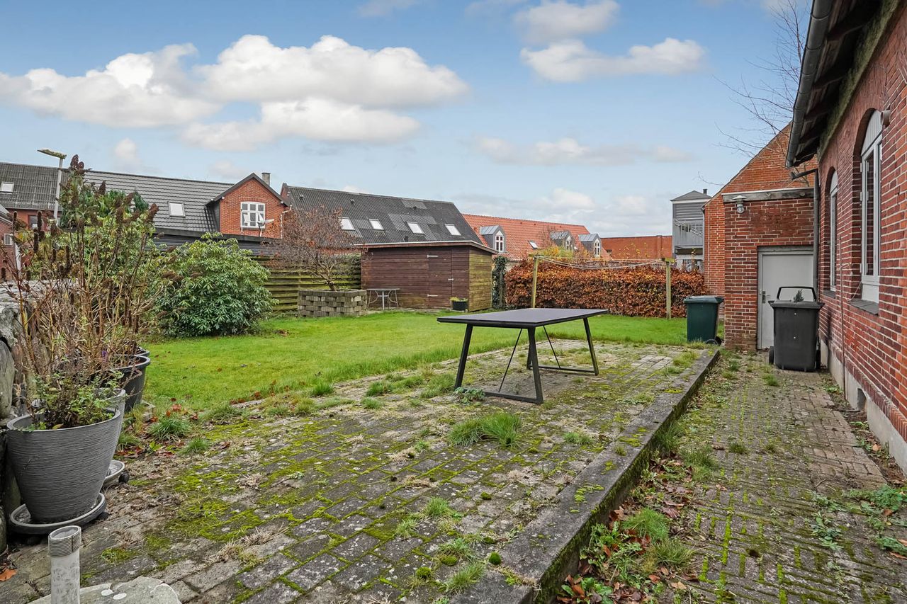 Omgivet at en nem og overskuelig have og der er en god garage direkte ud til gaden